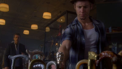 Andere Stöcke, gezeigt oder erwähnt In der Folge Airborne (Horrorflug) [S03-E18] macht House eine Bemerkung über einen antiken Winzerstock mit einem Korkenzieher im Griff, aber wir bekommen diesen Stock nie zu Gesicht, weil die Flughafensicherheit ihn als potentielle Waffe konfisziert hat. Der Stock wird in keiner anderen Folge erwähnt und kein gezeigter Stock entspricht den Beschreibungen. Ich habe im Internet gesucht und ein paar Winzerstöcke gefunden, aber alle scheinen handgemacht und einzigartig zu sein, was es nahezu unmöglich macht ohne jede weitere Beschreibung herauszufinden, wie der Stock von House aussieht. Hier ist ein gutes Beispiel für solch einen Stock bei Antique Cane World. In der Folge Family (Auf der Kippe) [S03-E21] begegnen House auf der Suche nach seinem geliebten Flammenstock einige seltsame Stöcke. Darunter sind ein Wanderstock mit einem silbernen Totenschädel und ein Stierpenis-Stock. Ja, das habt ihr ganz richtig gelesen, und ja, so etwas existiert wirklich. Tatsächlich sind diese sogar erschreckend verbreitet, oftmals jedoch etwas höflicher bezeichnet mit dem Namen "Stierorgan". House war recht beeindruckt vom Aussehen des Stockes, bis er erfahren hat, woraus er gemacht ist. "Penisstöcke sind für Mörder", erwiderte er, als er den Stock dem Verkäufer wieder in die Hand drückte. |