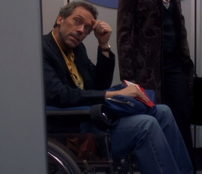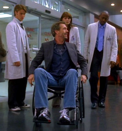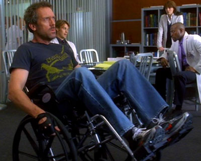 Houses Parkplatz wurde an eine neue Ärztin im Rollstuhl vergeben. House argumentiert gegenüber Cuddy, dass es für ihn viel schwerer ist mit einem Stock über den Parkplatz zu laufen, als für die andere Ärztin in ihrem Rollstuhl, wo sie nur einen Hebel drücken muss, um die gleiche Distanz rollenderweise zurückzulegen. Cuddy weigert sich nachzugeben, also bietet House ihr die Wette an, eine Woche im Rollstuhl zu verbringen, wenn sie ihm im Gegenzug seinen Parkplatz wiedergibt. Am nächsten Tag kommt er rollend daher und überrascht damit auch seine Angestellten. |