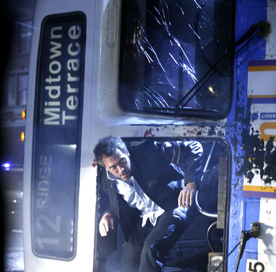 Odcinek rozpoczyna się zaraz po wypadku autobusowym, w którym House stracił laskę. Nigdy nie widzimy Laski z płomieniami w czasie rzeczywistym, ale poprzez serię retrospekcji w tym i następnym odcinku, układamy w całość serię wydarzeń, w tym zejście Laski z płomieniami. Tak jakby. Ujęcie to sugeruje, że Laska z płomieniami poleciała aby zginąć gdzieś we wraku. Jednak widoczna tu laska nie ma płomieni i wygląda podejrzanie jak wygenerowana komputerowo. Możemy debatować nad symboliczną utratą płomieni przez laskę lub możemy przyjąć, że spece od efektów się spieszyli... tak czy inaczej, mamy wierzyć, że jest to ostatni raz kiedy widzimy laskę #5.  |