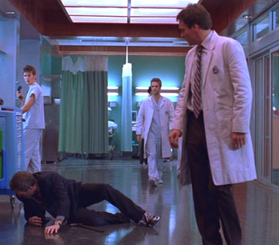Уилсон временно живет в квартире Хауса. Тот достает его своими шуточками с утра до ночи, практически умоляя Уилсона отомстить ему. Уилсон в конце концов принимает вызов и подпиливает его трость, в результате чего она ломается чуть позже. Неожиданно потеряв опору, Хаус в недоумении валится на пол. | ![]() |